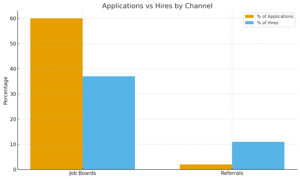 - Referrals perform exceptionally well, but employer networks and personal networks exhaust quickly, leaving no mechanism to scale them.